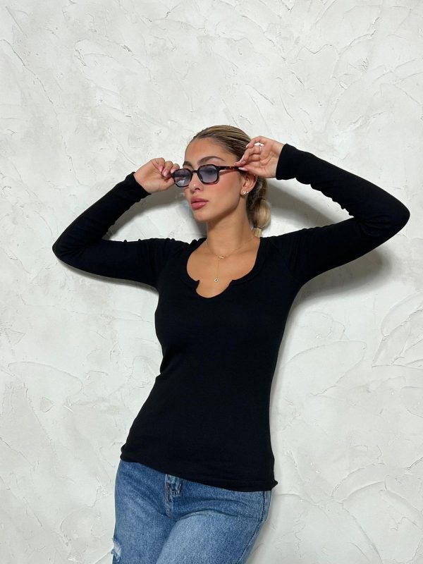 חולצת בייסיק מבד פיין ריב עם מפתח V עמוק מידות 1-2 הדוגמננית לובשת מידה 1
